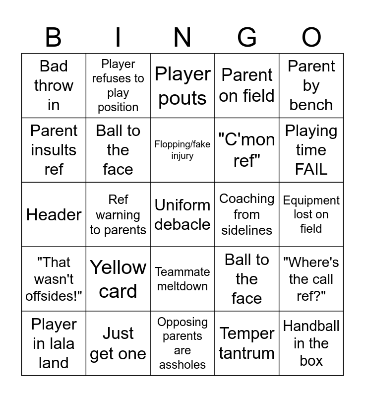 This bingo card has 25 words: Yellow card, Opposing parents are assholes, Flopping/fake injury, Player in lala land, Parent by bench, Bad throw in, Parent insults ref, Player refuses to play position, Coaching from sidelines, Teammate meltdown, "C'mon ref", Header, Ball to the face, "Where's the call ref?", Ball to the face, Handball in the box, Equipment lost on field, Player pouts, Playing time FAIL, Ref warning to parents, Uniform debacle, Just get one, "That wasn't offsides!", Parent on field and Temper tantrum.
