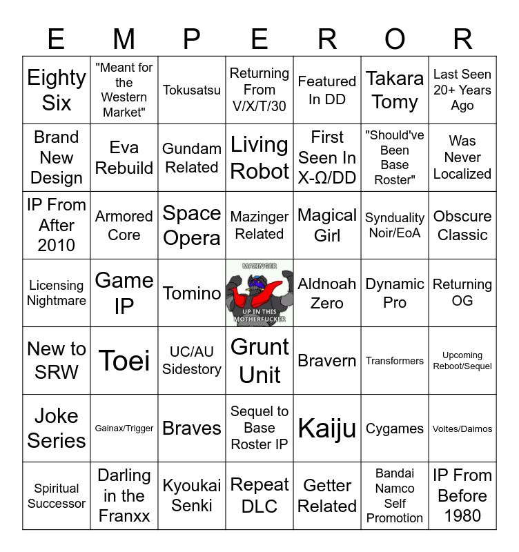 This bingo card has a free space and 48 words: New to SRW, Game IP, Kyoukai Senki, Grunt Unit, First Seen In X-Ω/DD, Dynamic Pro, Last Seen 20+ Years Ago, Spiritual Successor, Armored Core, Tomino, Returning From V/X/T/30, Featured In DD, Synduality Noir/EoA, Obscure Classic, Licensing Nightmare, Gainax/Trigger, Tokusatsu, Mazinger Related, Kaiju, Takara Tomy, Was Never Localized, Brand New Design, "Meant for the Western Market", Gundam Related, Getter Related, "Should've Been Base Roster", Returning OG, Joke Series, Toei, Space Opera, Sequel to Base Roster IP, Magical Girl, Cygames, Voltes/Daimos, Eighty Six, Darling in the Franxx, UC/AU Sidestory, Repeat DLC, Aldnoah Zero, Bandai Namco Self Promotion, Upcoming Reboot/Sequel, IP From After 2010, Eva Rebuild, Braves, Living Robot, Bravern, Transformers and IP From Before 1980.