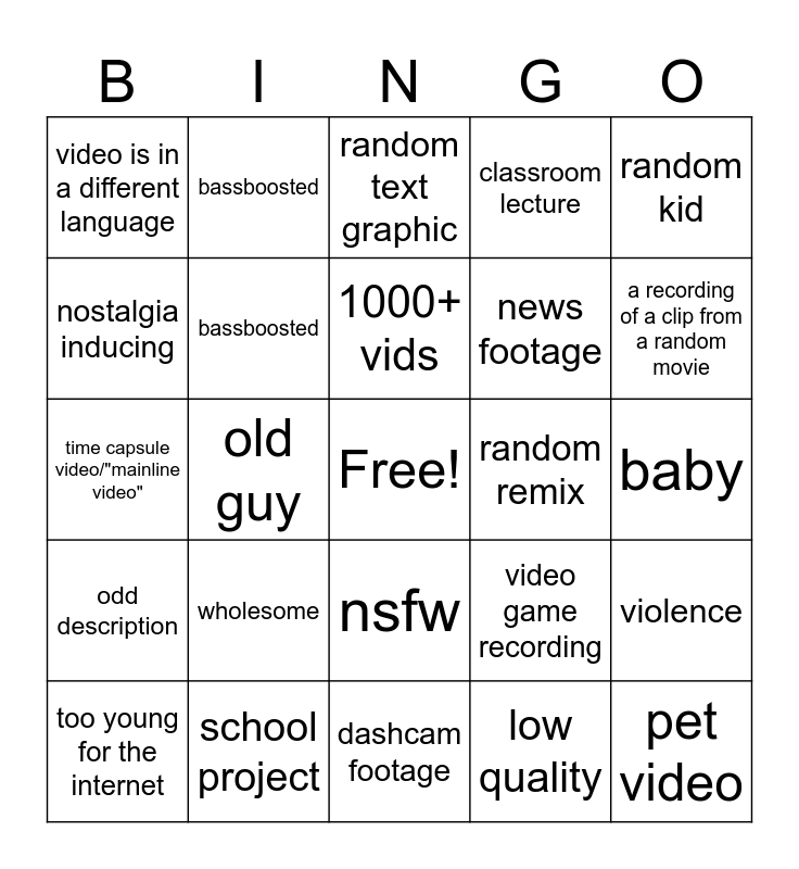This bingo card has a free space and 29 words: too young for the internet, creepy, old guy, smoking/drinking, video is in a different language, random text graphic, bassboosted, wholesome, random remix, school project, baby, pet video, dashcam footage, low quality, a recording of a clip from a random movie, security footage, nsfw, odd description, random kid, time capsule video/"mainline video", video game recording, house tour, news footage, nostalgia inducing, classroom lecture, bassboosted, violence, 1000+ vids and tutorial.