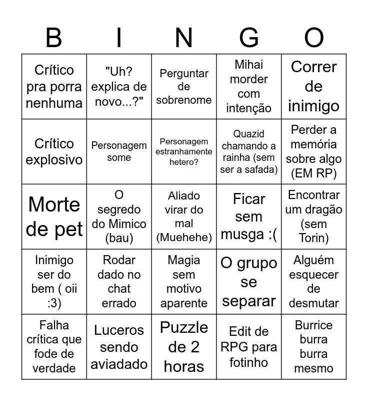 This bingo card has a free space and 54 words: Interação cringe com NPC, Inimigo ser do bem ( oii :3), Referência a LOL (sem querer), Varis indo solo (lonewolf auuu), Magia sem motivo aparente, Faltar componente para magia, Mihai morder com intenção, Apostassss Yipeeee (tigre medieval), Crítico explosivo, Torin tentando farmar aura, Crítico pra porra nenhuma, Mestre esquecendo algo MUITO importante, Luceros sendo aviadado, Falha crítica que fode de verdade, Ordem paranormal (referencia rpg antigo), Puzzle de 2 horas, Burrice burra burra mesmo, Quazid chamando a rainha (sem ser a safada), Yuzhu moggada pelo passaralho do carilho, Encontrar um dragão (sem Torin), O grupo se separar, Briga entre personagens, Ficar sem musga :(, Correr de inimigo, Brutal, sem nada pros betas, "Uh? explica de novo...?", Lingua comum incomum (portugues podre), Um velho sábio aparece, 3 falha seguida, Edit de RPG para fotinho, NPC chave morre (matarão meu pai), Não acertar hit na fight, Falha de comunicação, Grande Ilusão / Sonho, Perguntar de sobrenome, "isso é um... eclipse?" (namedrop), Morte de pet, Alguém esquecer de desmutar, Se perder na descrição, Personagem some, "e abrir um whiteboard hein?", Party contra inimigo fortão, Ambush (shh, grita baixo), Call secreta, Rodar dado no chat errado, Arma amaldiçoada, Roubar kill, Matar inocente(s), Personagem estranhamente hetero?, O segredo do Mimico (bau), Perder a memória sobre algo (EM RP), "você pode tentar..." (clássico do leandro), Alguém revive (NPC ou player) and Alguem ganhar Inspiração.