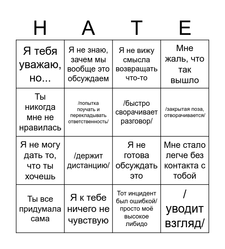 This bingo card has 16 words: Я к тебе ничего не чувствую, Мне стало легче без контакта с тобой, Я не вижу смысла возвращать что-то, Я тебя уважаю, но..., Я не могу дать то, что ты хочешь, Я не знаю, зачем мы вообще это обсуждаем, Я не готова обсуждать это, Тот инцидент был ошибкой/просто моё высокое либидо, Ты никогда мне не нравилась, /попытка поучать и перекладывать ответственность/, Ты все придумала сама, Мне жаль, что так вышло, /держит дистанцию/, /закрытая поза, отворачивается/, /быстро сворачивает разговор/ and /уводит взгляд/.