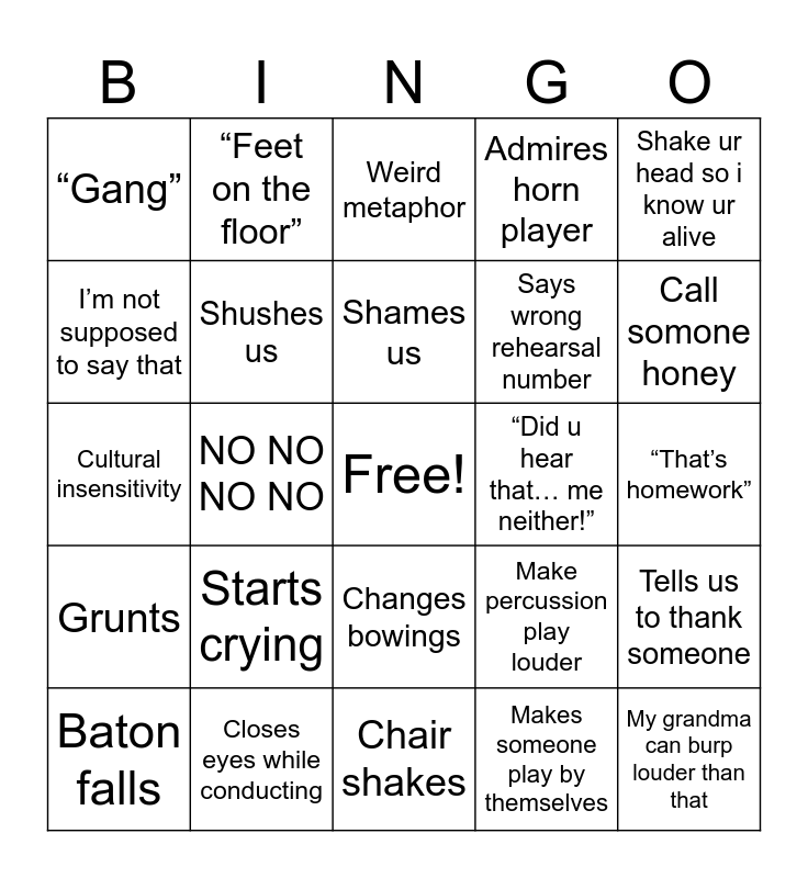 This bingo card has a free space and 27 words: Make percussion play louder, Sings a part, Says wrong rehearsal number, Chair shakes, I’m not supposed to say that, Weird metaphor, “Feet on the floor”, Grunts, “Did u hear that… me neither!”, Tells us to thank someone, Cultural insensitivity, Admires horn player, Baton falls, Closes eyes while conducting, Call somone honey, Says wrong name, Shushes us, Shames us, Starts crying, “Gang”, “That’s homework”, Makes someone play by themselves, NO NO NO NO, My grandma can burp louder than that, Changes bowings, Shake ur head so i know ur alive and I’m a cunductor i cant hear you talk.