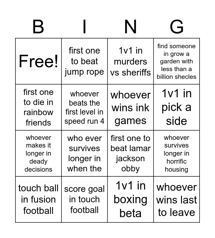 This bingo card has 16 words: touch ball in fusion football, score goal in touch football, 1v1 in murders vs sheriffs, find someone in grow a garden with less than a billion shecles, first one to die in rainbow friends, first one to beat jump rope, first one to beat lamar jackson obby, whoever survives longer in horrific housing, Free!, whoever beats the first level in speed run 4, 1v1 in boxing beta, 1v1 in pick a side, whoever makes it longer in deady decisions, who ever survives longer in when the, whoever wins ink games and whoever wins last to leave.