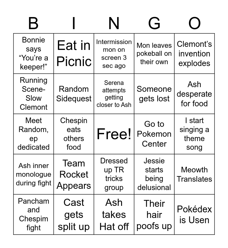 This bingo card has a free space and 24 words: Team Rocket Appears, Cast gets split up, Serena attempts getting closer to Ash, Pancham and Chespim fight, Clemont’s invention explodes, Bonnie says “You’re a keeper!”, Running Scene- Slow Clemont, Eat in Picnic, Go to Pokemon Center, Dressed up TR tricks group, Someone gets lost, Meet Random, ep dedicated, Jessie starts being delusional, Meowth Translates, Random Sidequest, Their hair poofs up, I start singing a theme song, Intermission mon on screen 3 sec ago, Ash desperate for food, Chespin eats others food, Pokédex is Usen, Ash inner monologue during fight, Mon leaves pokeball on their own and Ash takes Hat off.