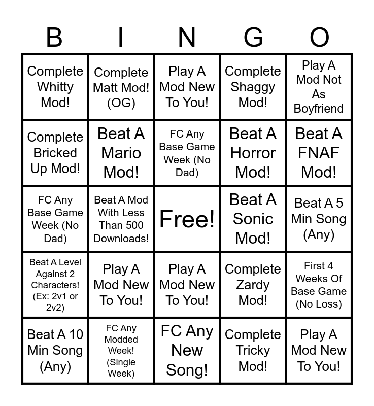 This bingo card has a free space and 24 words: Play A Mod New To You!, FC Any Modded Week! (Single Week), FC Any Base Game Week (No Dad), Beat A 10 Min Song (Any), Play A Mod Not As Boyfriend, Complete Whitty Mod!, Complete Bricked Up Mod!, Complete Matt Mod! (OG), Beat A Sonic Mod!, Play A Mod New To You!, Beat A Horror Mod!, FC Any Base Game Week (No Dad), Complete Zardy Mod!, First 4 Weeks Of Base Game (No Loss), Beat A Mario Mod!, Complete Tricky Mod!, Beat A 5 Min Song (Any), Play A Mod New To You!, Beat A FNAF Mod!, Beat A Mod With Less Than 500 Downloads!, Play A Mod New To You!, Beat A Level Against 2 Characters! (Ex: 2v1 or 2v2), Complete Shaggy Mod! and FC Any New Song!.