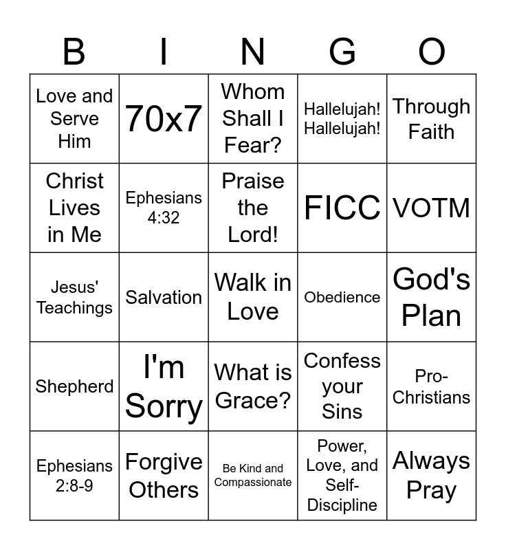 This bingo card has a free space and 24 words: I'm Sorry, Forgive Others, Praise the Lord!, Ephesians 2:8-9, Through Faith, Love and Serve Him, Christ Lives in Me, 70x7, Obedience, What is Grace?, FICC, Jesus' Teachings, Confess your Sins, Pro-Christians, Ephesians 4:32, Power, Love, and Self-Discipline, God's Plan, Whom Shall I Fear?, VOTM, Salvation, Always Pray, Shepherd, Hallelujah! Hallelujah! and Be Kind and Compassionate.