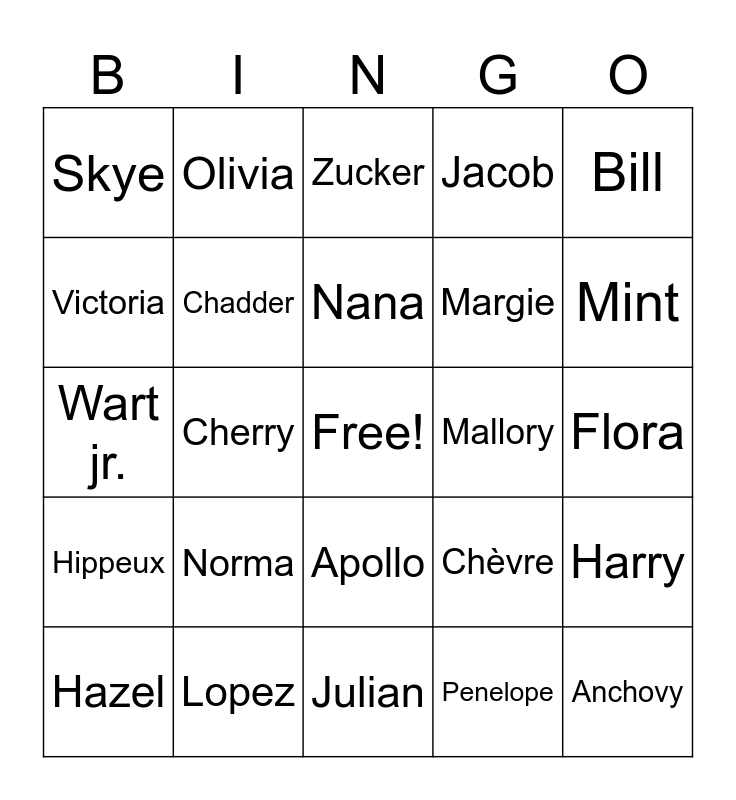 This bingo card has a free space and 24 words: Norma, Lopez, Nana, Hazel, Bill, Skye, Victoria, Olivia, Mallory, Apollo, Margie, Wart jr., Chèvre, Harry, Chadder, Penelope, Flora, Zucker, Mint, Cherry, Anchovy, Hippeux, Jacob and Julian.