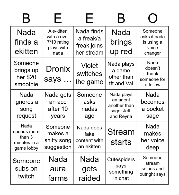 This bingo card has 25 words: Someone makes a shitty song suggestion, Nada gets raided, Violet switches the game, Someone subs on twitch, Someone asks if nada is using a voice changer, Nada finds a ekitten, Someone brings up her $20 smoothie, A e-kitten with a over 7/10 rating plays with nada, Nada plays an agent another than sage, Jett, and Reyna, Nada does fake content with an ekitten, Nada plays a game other than tft and Val, Nada ignores a song request, Stream starts, Nada makes her voice deep, Dronix says …, Someone stream snipes and outright says it, Nada becomes a pocket sage, Nada finds a freak/a freak joins her stream, Nada doesn’t thank someone for a follow, Nada gets an ace after 10 years, Someone asks nadas age, Nada aura farms, Nada spends more than 3 minutes in a game lobby, Nada brings up red and Cutespiders says something in chat.