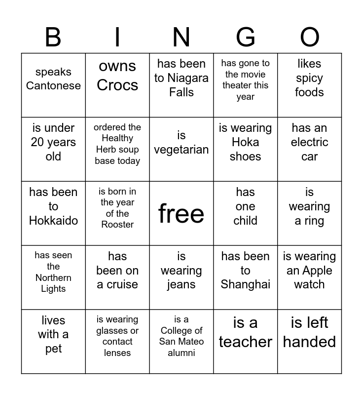 This bingo card has a free space and 24 words: has been on a cruise, is wearing glasses or contact lenses, is vegetarian, lives with a pet, likes spicy foods, speaks Cantonese, is under 20 years old, owns Crocs, has one child, is wearing jeans, is wearing Hoka shoes, has been to Hokkaido, has been to Shanghai, is wearing an Apple watch, ordered the Healthy Herb soup base today, is a teacher, is wearing a ring, has been to Niagara Falls, has an electric car, is born in the year of the Rooster, is left handed, has seen the Northern Lights, has gone to the movie theater this year and is a College of San Mateo alumni.