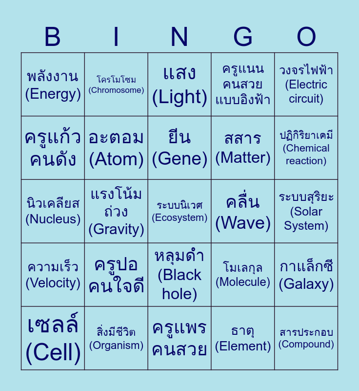 This bingo card has 30 words: เซลล์ (Cell), ดีเอ็นเอ (DNA), ยีน (Gene), ดาวเคราะห์ (Planet), วงจรไฟฟ้า (Electric circuit), พลังงาน (Energy), โครโมโซม (Chromosome), หลุมดำ (Black hole), คลื่น (Wave), สารประกอบ (Compound), ความเร็ว (Velocity), อะตอม (Atom), Free!, ธาตุ (Element), กาแล็กซี (Galaxy), สมมติฐาน (Hypothesis), แรงโน้มถ่วง (Gravity), ระบบนิเวศ (Ecosystem), โมเลกุล (Molecule), ปฏิกิริยาเคมี (Chemical reaction), นิวเคลียส (Nucleus), สิ่งมีชีวิต (Organism), แสง (Light), สสาร (Matter), ระบบสุริยะ (Solar System), ครูแก้วคนดัง, ครูปอคนใจดี, ครูแพรคนสวย, ครูแนน คนสวยแบบอิงฟ้า and ครูปุ๊กคนคมเป๊ะ.
