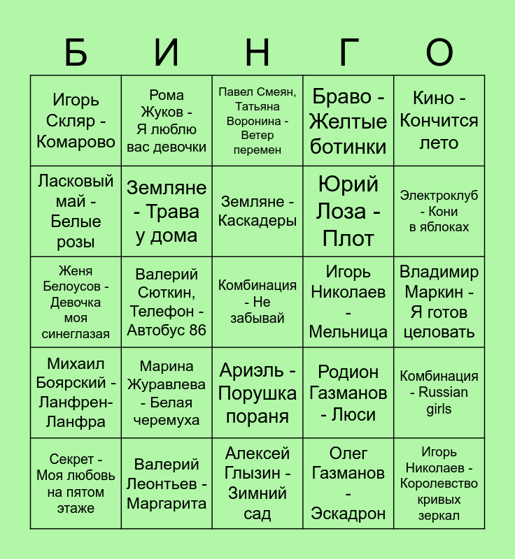 This bingo card has a free space and 24 words: Марина Журавлева - Белая черемуха, Валерий Леонтьев - Маргарита, Земляне - Каскадеры, Секрет - Моя любовь на пятом этаже, Кино - Кончится лето, Игорь Скляр - Комарово, Ласковый май - Белые розы, Рома Жуков - Я люблю вас девочки, Игорь Николаев - Мельница, Ариэль - Порушка пораня, Юрий Лоза - Плот, Женя Белоусов - Девочка моя синеглазая, Родион Газманов - Люси, Комбинация - Russian girls, Земляне - Трава у дома, Олег Газманов - Эскадрон, Владимир Маркин - Я готов целовать, Павел Смеян, Татьяна Воронина - Ветер перемен, Электроклуб - Кони в яблоках, Валерий Сюткин, Телефон - Автобус 86, Игорь Николаев - Королевство кривых зеркал, Михаил Боярский - Ланфрен-Ланфра, Браво - Желтые ботинки and Алексей Глызин - Зимний сад.