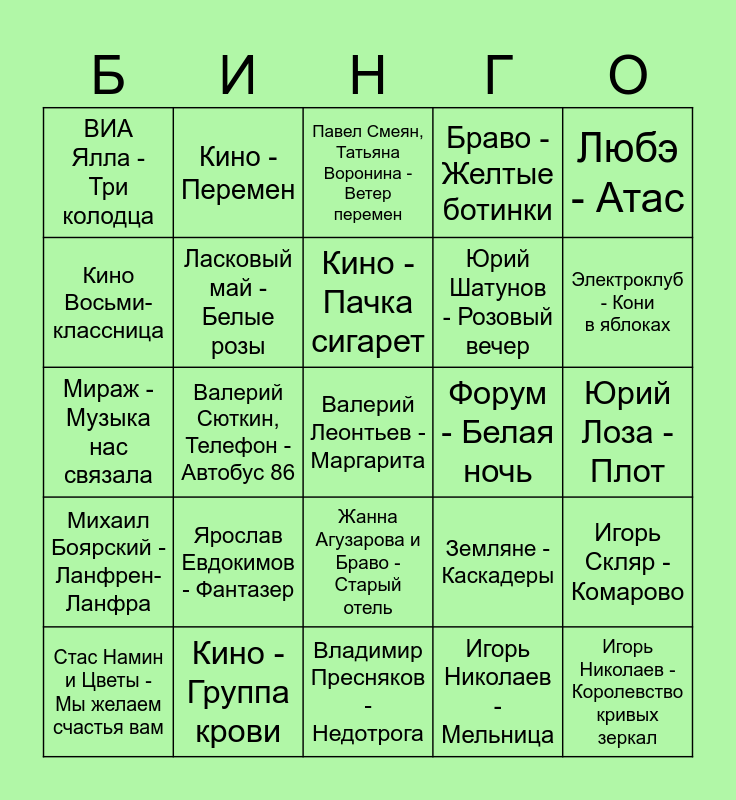 This bingo card has a free space and 24 words: Ярослав Евдокимов - Фантазер, Кино - Группа крови, Кино - Пачка сигарет, Стас Намин и Цветы - Мы желаем счастья вам, Любэ - Атас, ВИА Ялла - Три колодца, Кино Восьми-классница, Кино - Перемен, Форум - Белая ночь, Жанна Агузарова и Браво - Старый отель, Юрий Шатунов - Розовый вечер, Мираж - Музыка нас связала, Земляне - Каскадеры, Игорь Скляр - Комарово, Ласковый май - Белые розы, Игорь Николаев - Мельница, Юрий Лоза - Плот, Павел Смеян, Татьяна Воронина - Ветер перемен, Электроклуб - Кони в яблоках, Валерий Сюткин, Телефон - Автобус 86, Игорь Николаев - Королевство кривых зеркал, Михаил Боярский - Ланфрен-Ланфра, Браво - Желтые ботинки and Владимир Пресняков - Недотрога.