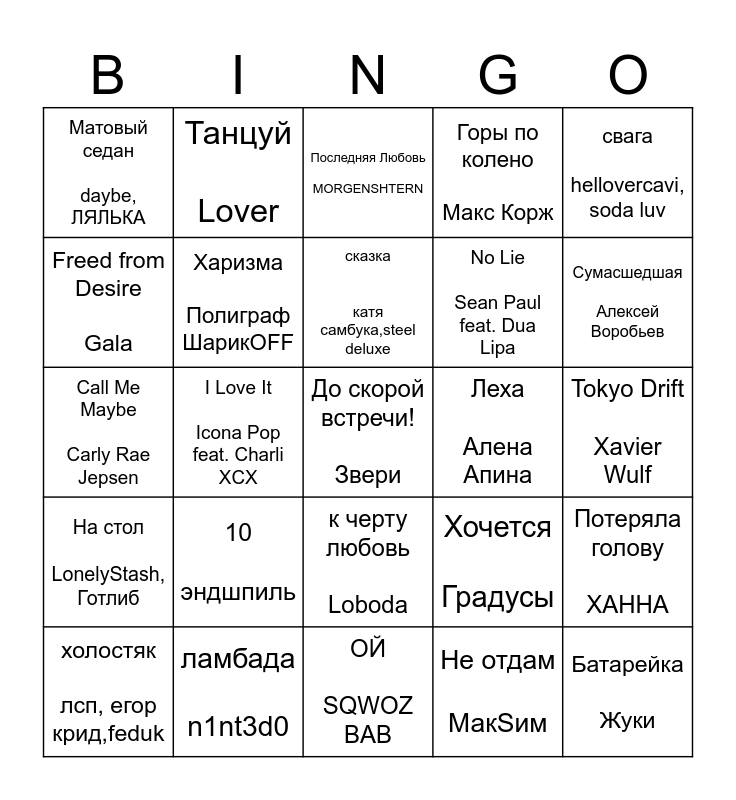 This bingo card has a free space and 24 words: 10 эндшпиль, ламбада n1nt3d0, сказка катя самбука,steel deluxe, холостяк лсп, егор крид,feduk, свага hellovercavi, soda luv, Матовый седан daybe, ЛЯЛЬКА, Freed from Desire Gala, Танцуй Lover, Леха Алена Апина, к черту любовь Loboda, No Lie Sean Paul feat. Dua Lipa, Call Me Maybe Carly Rae Jepsen, Хочется Градусы, Потеряла голову ХАННА, Харизма Полиграф ШарикOFF, Не отдам МакSим, Tokyo Drift Xavier Wulf, Последняя Любовь MORGENSHTERN, Сумасшедшая Алексей Воробьев, I Love It Icona Pop feat. Charli XCX, Батарейка Жуки, На стол LonelyStash, Готлиб, Горы по колено Макс Корж and ОЙ SQWOZ BAB.