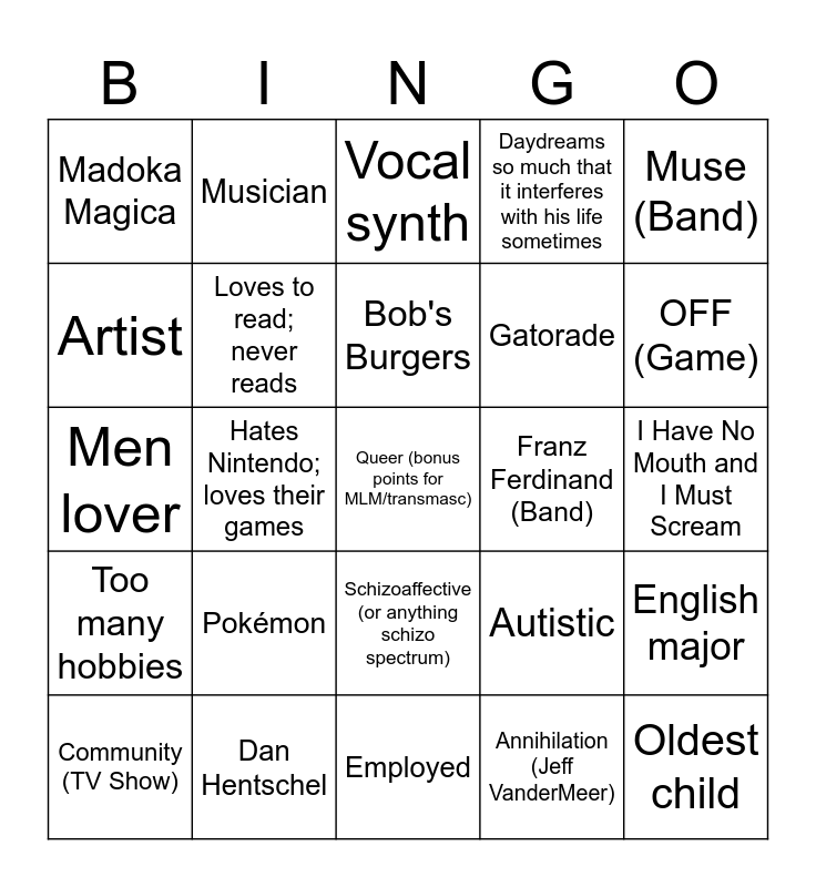 This bingo card has a free space and 24 words: Pokémon, Dan Hentschel, Bob's Burgers, Community (TV Show), Muse (Band), Madoka Magica, Artist, Musician, Franz Ferdinand (Band), Schizoaffective (or anything schizo spectrum), Gatorade, Men lover, Autistic, English major, Loves to read; never reads, Annihilation (Jeff VanderMeer), I Have No Mouth and I Must Scream, Vocal synth, OFF (Game), Hates Nintendo; loves their games, Oldest child, Too many hobbies, Daydreams so much that it interferes with his life sometimes and Employed.