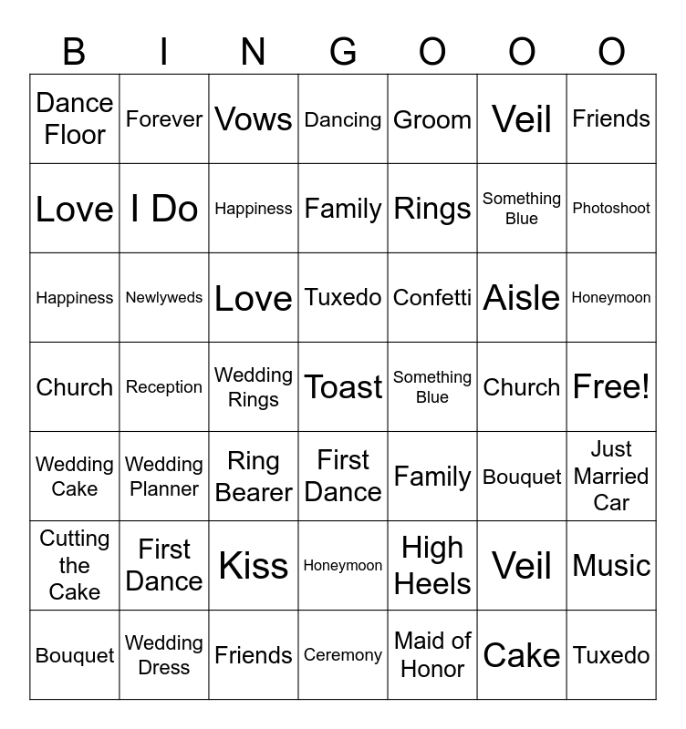 This bingo card has a free space and 74 words: Wedding Dress, Bouquet, Vows, Kiss, Bridesmaids, Groom, First Dance, Cake, Honeymoon, Engagement Ring, Church, Reception, Love, Veil, Bride, Rings, Tuxedo, Happiness, Flowers, Family, Friends, Forever, Dancing, Free!, Something Blue, Wedding Dress, Veil, Bouquet, Bridesmaids, Maid of Honor, Groom, Best Man, Groomsmen, Flower Girl, Ring Bearer, Wedding Rings, Vows, Kiss, First Dance, Cutting the Cake, Reception, Church, Ceremony, Toast, Champagne, Dance Floor, Something Blue, Love, Forever, Family, Friends, Laughter, Happiness, Honeymoon, Proposal, Engagement Ring, Tuxedo, Wedding Cake, Invitation, Aisle, I Do, Bride, Newlyweds, Just Married Car, Photoshoot, Wedding Planner, Centerpiece, Music, Confetti, High Heels, Perfume, Makeup, Dancing and Romance.