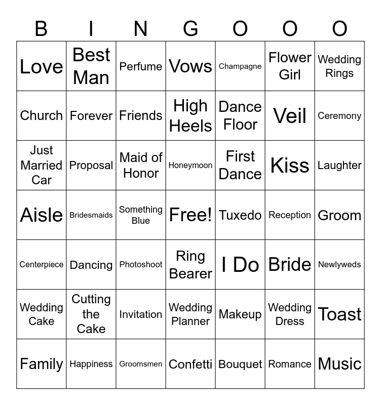 This bingo card has a free space and 49 words: Wedding Dress, Veil, Bouquet, Bridesmaids, Maid of Honor, Groom, Best Man, Groomsmen, Flower Girl, Ring Bearer, Wedding Rings, Vows, Kiss, First Dance, Cutting the Cake, Reception, Church, Ceremony, Toast, Champagne, Dance Floor, Something Blue, Love, Forever, Family, Friends, Laughter, Happiness, Honeymoon, Proposal, Engagement Ring, Tuxedo, Wedding Cake, Invitation, Aisle, I Do, Bride, Newlyweds, Just Married Car, Photoshoot, Wedding Planner, Centerpiece, Music, Confetti, High Heels, Perfume, Makeup, Dancing and Romance.