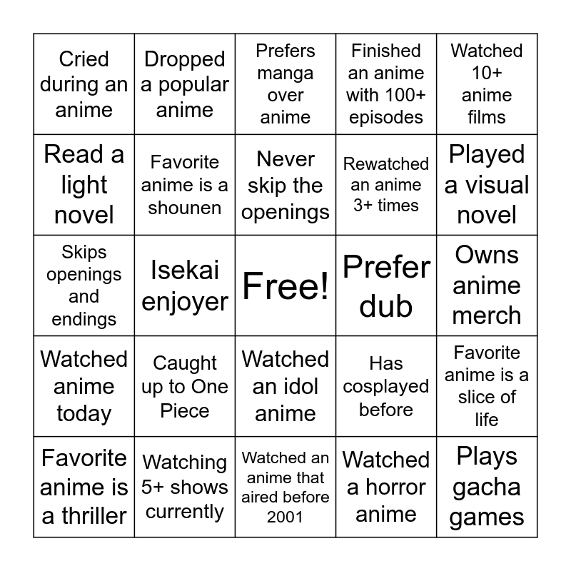 This bingo card has a free space and 38 words: Watched over 100 anime, Watching 3+ shows this season, Favorite anime is a romance, Favorite anime is a shounen, Favorite anime is a slice of life, Caught up to One Piece, Never skip the openings, Never skip the endings, Watched 10+ anime films, Rewatched an anime 3+ times, Isekai enjoyer, Finished an anime with 100+ episodes, Plays gacha games, Owns anime merch, Read a light novel, Watched anime today, Likes sports anime, Prefers manga over anime, Watched a cg anime, Prefer dub, Cried during an anime, Watching 5+ shows currently, Played a visual novel, Favorite anime is a thriller, Read the manga before watching the anime, Watched an anime that aired before 2001, Watched a magical girl anime, Watched a mecha anime, Favorite anime is a comedy, Favorite anime is sifi, Favorite anime is fantasy, Watched an idol anime, Watched a horror anime, Dropped a popular anime, Favorite anime is a shoujo, Has cosplayed before, Skips openings and endings and Has an anime song in their playlist.