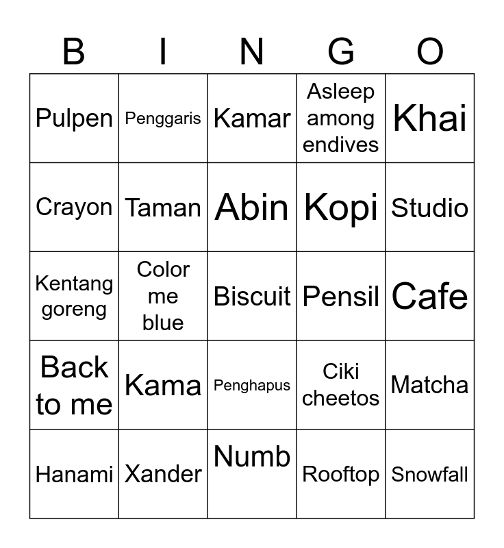 This bingo card has a free space and 24 words: Kama, Xander, Abin, Hanami, Khai, Pulpen, Crayon, Penggaris, Pensil, Penghapus, Kopi, Kentang goreng, Ciki cheetos, Matcha, Taman, Rooftop, Cafe, Kamar, Studio, Color me blue, Snowfall, Back to me, Asleep among endives and Numb.