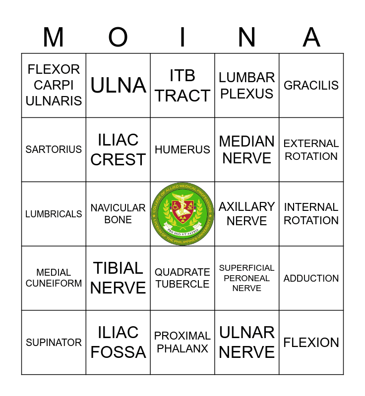 This bingo card has a free space and 84 words: SUPRA SPINATUS, SCAPULA, HUMERUS, SUPRA SCAPULAR NERVE, ABDUCTION, TERES MAJOR, HUMERUS, RADIUS, RADIAL NERVE, FLEXION, BICEPS BRACHII, RADIUS, AXILLARY NERVE, ADDUCTION, TRICEPS, ULNA, PISIFORM, MEDIAN NERVE, EXTENSION, PRONATOR TERES, PISIFORM, PROXIMAL PHALANX, ULNAR NERVE, SUPINATION, FLEXOR CARPI ULNARIS, SCAPHOID, EXTENSOR EXPANSION, LOWER SUBSCAPULAR NERVE, PRONATION, ANCONEUS, ILIAC CREST, ULNA, INFERIOR GLUTEAL NERVE, INTERNAL ROTATION, SUPINATOR, SACRUM, FIRST METACARPAL, SUPERIOR GLUTEAL NERVE, EXTERNAL ROTATION, LUMBRICALS, ISCHIAL TUBEROSITY, GREATER TROCHANTER, SACRAL PLEXUS, PLANTAR FLEXION, ABDUCTOR DIGITI MINIMI, COCCYX, ITB TRACT, FEMORAL NERVE, DORSI FLEXION, GLUTEUS MAXIMUS, ASIS, QUADRATE TUBERCLE, LUMBAR PLEXUS, EVERSION, TENSOR FASCIA LATA, SUPERIOR RAMUS, LESSER TROCHANTER, SUPERFICIAL PERONEAL NERVE, INVERSION, SARTORIUS, CALCANEUM, QUADRICEPS TENDON, MEDIAL PLANTAR NERVE, LATERAL FLEXION, PSOAS, FIBULA, ADDUCTOR TUBERCLE, LATERAL PLANTAR NERVE, GRACILIS, TIBIA, NAVICULAR BONE, DEEP PERONEAL NERVE, ADDUCTOR MAGNUS, INFERIOR RAMUS, MEDIAL CUNEIFORM, TIBIAL NERVE, TIBIALIS ANTERIOR, LINEA ASPERA, OBTURATOR NERVE, GASTROCS, ILIAC FOSSA, SCIATIC NERVE, FLEXOR HALLUCIS LONGUS and SOLEUS.