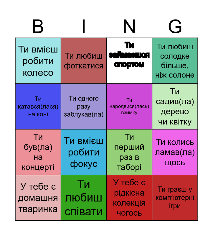 This bingo card has 16 words: У тебе є домашня тваринка, Ти любиш співати, Ти займаєшся спортом, Ти любиш солодке більше, ніж солоне, Ти катався(лася) на коні, Ти любиш фоткатися, Ти перший раз в таборі, Ти колись ламав(ла) щось, Ти вмієш робити колесо, Ти одного разу заблукав(ла), У тебе є рідкісна колекція чогось, Ти садив(ла) дерево чи квітку, Ти був(ла) на концерті, Ти вмієш робити фокус, Ти народвися(лась) взимку and Ти граєш у компʼютерні ігри.