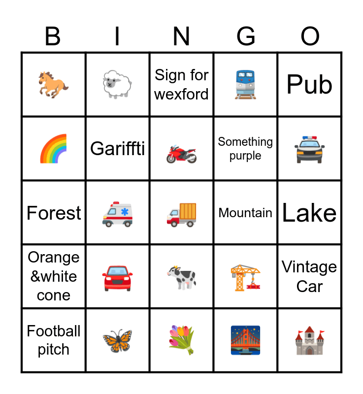 This bingo card has a free space and 24 words: 🚘, 🦋, 🏍, Football pitch, Pub, 🐎, 🌈, 🐑, Mountain, 🐄, Something purple, Forest, 🏗, Vintage Car, Gariffti, 🌉, Lake, Sign for wexford, 🚔, 🚑, 🏰, Orange &white cone, 🚆 and 💐.