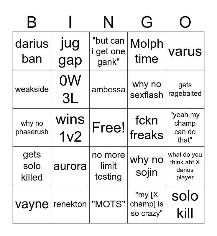 This bingo card has a free space and 24 words: aurora, renekton, ambessa, vayne, varus, darius ban, weakside, jug gap, fckn freaks, no more limit testing, why no sexflash, why no phaserush, why no sojin, what do you think abt X darius player, 0W 3L, "my [X champ] is so crazy", "yeah my champ can do that", "but can i get one gank", gets ragebaited, wins 1v2, solo kill, gets solo killed, Molph time and "MOTS".