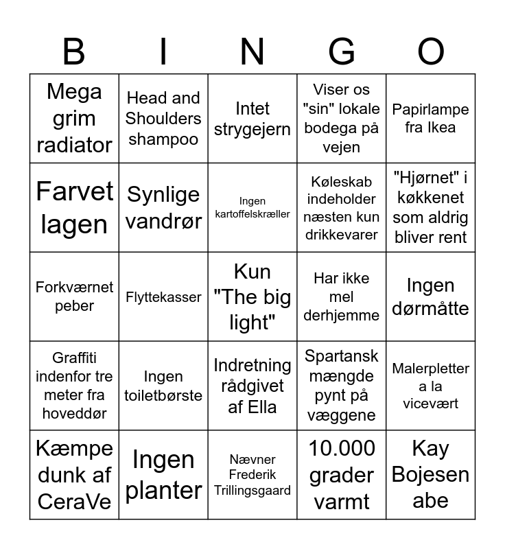 This bingo card has a free space and 24 words: Ingen toiletbørste, Ingen planter, Ingen kartoffelskræller, Kæmpe dunk af CeraVe, Papirlampe fra Ikea, Mega grim radiator, Farvet lagen, Head and Shoulders shampoo, Har ikke mel derhjemme, Indretning rådgivet af Ella, Køleskab indeholder næsten kun drikkevarer, Forkværnet peber, Spartansk mængde pynt på væggene, Malerpletter a la vicevært, Synlige vandrør, 10.000 grader varmt, Ingen dørmåtte, Intet strygejern, "Hjørnet" i køkkenet som aldrig bliver rent, Flyttekasser, Kay Bojesen abe, Graffiti indenfor tre meter fra hoveddør, Viser os "sin" lokale bodega på vejen and Nævner Frederik Trillingsgaard.