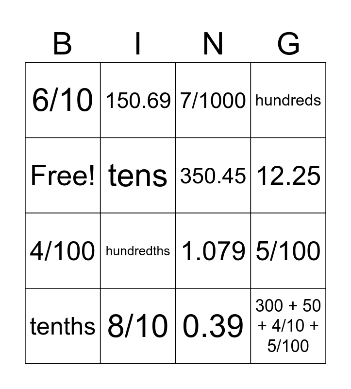 This bingo card has 16 words: 8/10, 5/100, 7/1000, 6/10, 4/100, 150.69, 1.079, 0.39, Free!, tens, tenths, hundreds, hundredths, 12.25, 350.45 and 300 + 50 + 4/10 + 5/100.