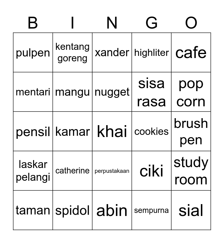 This bingo card has a free space and 24 words: catherine, spidol, nugget, taman, cafe, pulpen, mentari, kentang goreng, cookies, perpustakaan, sisa rasa, pensil, ciki, study room, mangu, sempurna, brush pen, xander, pop corn, kamar, sial, laskar pelangi, highliter and abin.