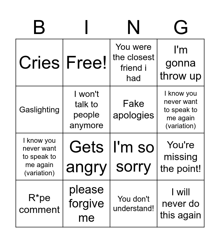 This bingo card has 19 words: I'm so sorry, I didn't mean it, You were the closest friend i had, I will never do this again, You're missing the point!, Gaslighting, You don't understand!, Cries, Free!, I know you never want to speak to me again (variation), Gets angry, I won't talk to people anymore, Fake apologies, please forgive me, R*pe comment, I know you will never forgive me, I'm gonna throw up, I know you never want to speak to me again (variation) and Cries.