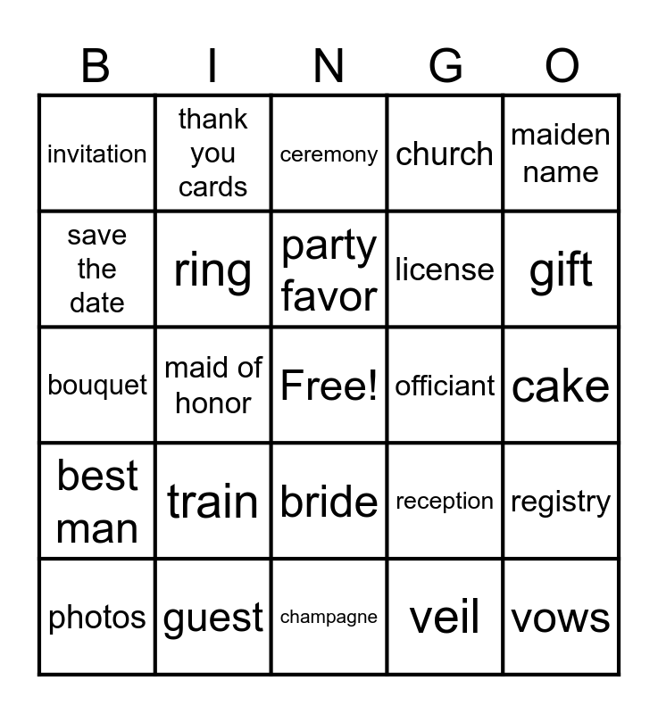This bingo card has a free space and 53 words: wedding, vows, venue, veil, train, toast, thank you cards, speech, save the date, RSVP, ring, rehearsal dinner, registry, reception, proposal, photos, party favor, officiant, menu, maiden name, maid of honor, love, license, invitation, honeymoon, guest, groomsmen, groom, gown, gift, garter, friends & family, first dance, engagement, elope, diamond, church, champagne, ceremony, centerpiece, caterer, cake topper, cake, bustle, bridesmaids, bride, bridal shower, boutonniere, bouquet, best man, bachelorette, bachelor and announcement.