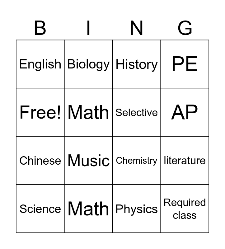 This bingo card has 16 words: Math, literature, History, English, Chinese, Biology, Chemistry, Physics, Free!, Math, Science, PE, Music, AP, Selective and Required class.