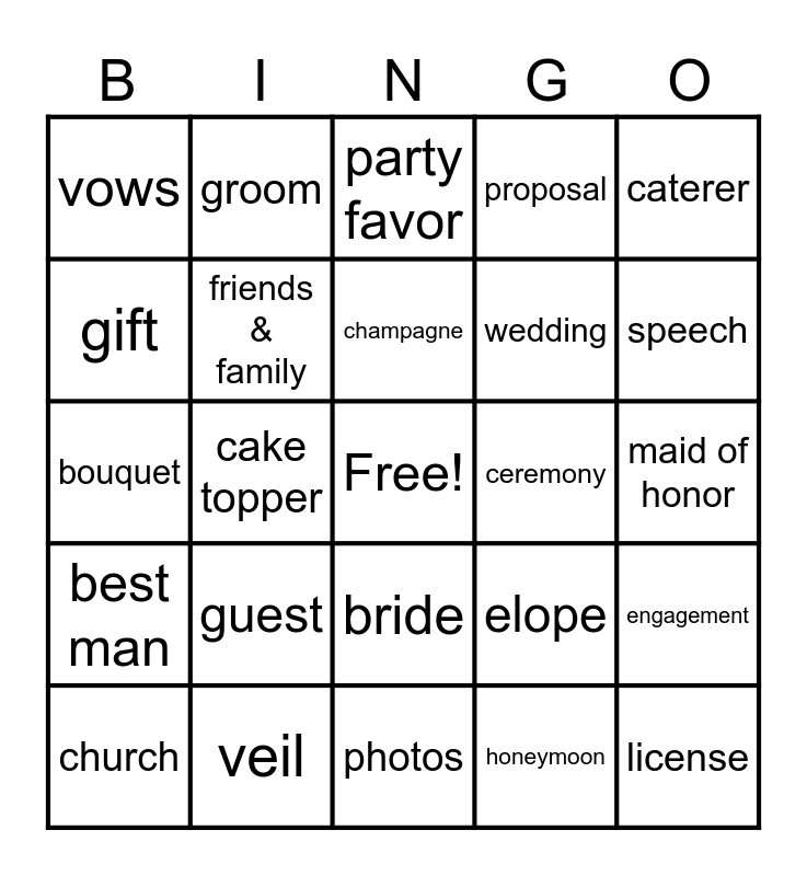 This bingo card has a free space and 53 words: love, license, invitation, honeymoon, guest, groomsmen, groom, gown, gift, garter, friends & family, first dance, engagement, elope, diamond, church, champagne, ceremony, centerpiece, caterer, cake topper, cake, wedding, vows, venue, veil, train, toast, thank you cards, speech, save the date, RSVP, ring, rehearsal dinner, registry, reception, proposal, photos, party favor, officiant, menu, maiden name, maid of honor, bustle, bridesmaids, bride, bridal shower, boutonniere, bouquet, best man, bachelorette, bachelor and announcement.