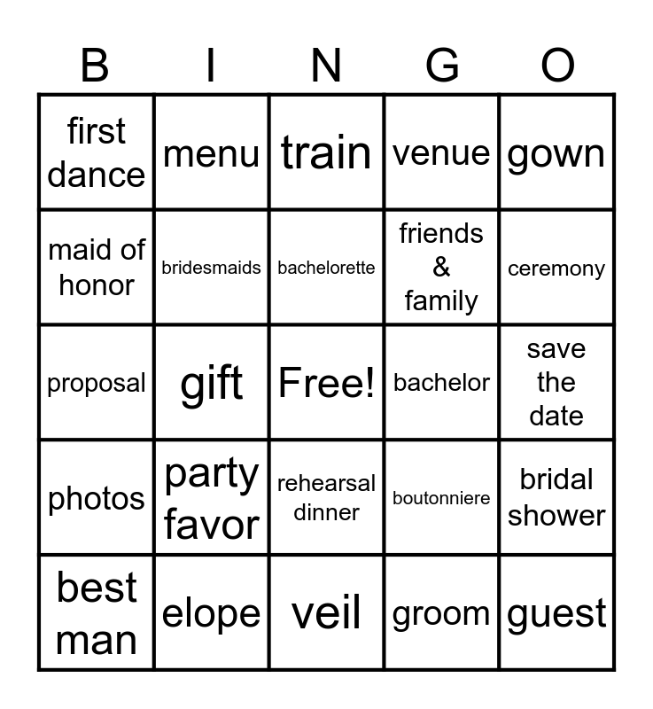This bingo card has a free space and 53 words: honeymoon, guest, groomsmen, groom, party favor, officiant, menu, maiden name, maid of honor, bustle, bridesmaids, bride, bridal shower, boutonniere, bouquet, best man, bachelorette, bachelor, announcement, gown, gift, garter, friends & family, first dance, engagement, elope, diamond, church, champagne, ceremony, centerpiece, caterer, cake topper, cake, wedding, vows, venue, veil, train, toast, thank you cards, speech, save the date, RSVP, ring, rehearsal dinner, registry, reception, proposal, photos, love, license and invitation.