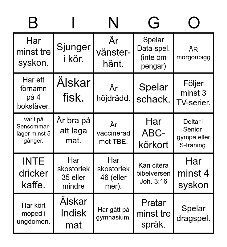 This bingo card has 30 words: Älskar Indisk mat, Har bott utomlands minst 6 månader, Är bra på att laga mat., Har efternamn som börjar på W., Har minst tre syskon., Är vänster-hänt., Älskar fisk., Har skostorlek 46 (eller mer)., Har ABC-körkort, Har gått på gymnasium., Deltar i Senior-gympa eller S-träning., Är vaccinerad mot TBE., Pratar minst tre språk., Spelar dragspel., Följer minst 3 TV-serier., Kan inte vissla. (bevis krävs), Kan citera bibelversen Joh. 3:16, INTE dricker kaffe., Har skostorlek 35 eller mindre, ÄR morgonpigg, Varit på Sensommar-läger minst 5 gånger., Har gröna ögon., Sjunger i kör., Spelar schack., Har ett förnamn på 4 bokstäver., Spelar Data-spel. (inte om pengar), Har minst 4 syskon, Har kört moped i ungdomen., Är höjdrädd. and Har 2 husdjur..