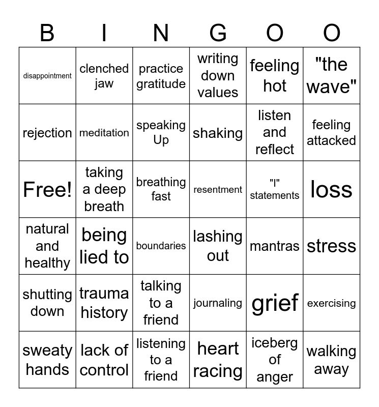 This bingo card has 36 words: journaling, talking to a friend, heart racing, rejection, natural and healthy, resentment, meditation, listening to a friend, feeling hot, grief, feeling attacked, writing down values, exercising, taking a deep breath, shaking, disappointment, shutting down, "I" statements, Free!, practice gratitude, breathing fast, being lied to, lashing out, boundaries, mantras, clenched jaw, listen and reflect, lack of control, speaking Up, "the wave", walking away, sweaty hands, stress, loss, trauma history and iceberg of anger.