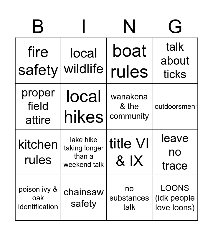 This bingo card has 16 words: chainsaw safety, leave no trace, boat rules, fire safety, kitchen rules, local wildlife, title VI & IX, no substances talk, proper field attire, local hikes, poison ivy & oak identification, talk about ticks, lake hike taking longer than a weekend talk, outdoorsmen, wanakena & the community and LOONS (idk people love loons).