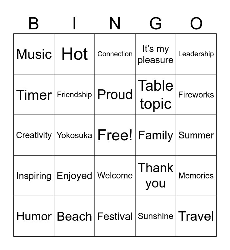 This bingo card has a free space and 29 words: Humor, Growth, Yokosuka, Imagination, Music, Connection, Friendship, Enjoyed, Family, Beach, Summer, Travel, Festival, Sunshine, Fireworks, Teamwork, Welcome, Inspiring, Leadership, Creativity, Thank you, Round of applause, Table topic, Timer, It’s my pleasure, Hot, Memories, Proud and Happy.