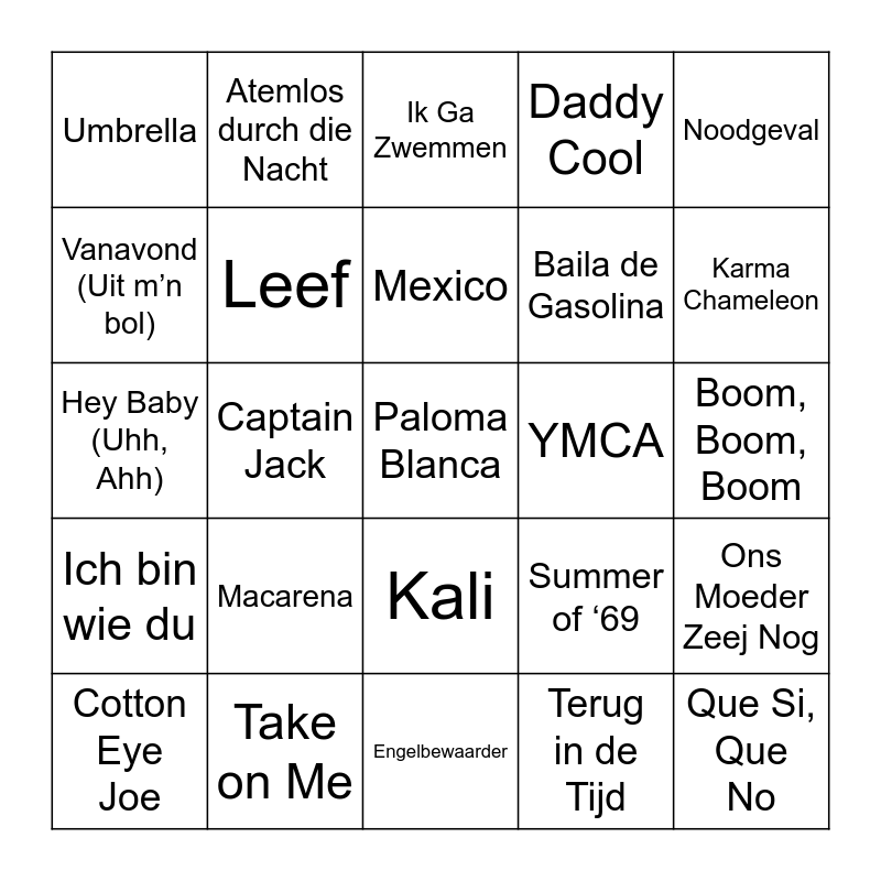 This bingo card has 41 words: Free!, Hey Baby (Uhh, Ahh), Freed From Desire, Leef, Take on Me, Kali, Mexico, De Toreador, Noodgeval, Ich bin wie du, Captain Jack, Daddy Cool, Paloma Blanca, Boom, Boom, Boom, YMCA, Macarena, Country Roads, Umbrella, Bestel Mar, Ik Ga Zwemmen, Ons Moeder Zeej Nog, Que Si, Que No, Engelbewaarder, Baila de Gasolina, Blikkendag, Bamboléo, Terug in de Tijd, Amalia, Karma Chameleon, Ma Baker, Voulez-Vous, Atemlos durch die Nacht, Cotton Eye Joe, I’m Still Standing, Summer of ‘69, Vanavond (Uit m’n bol), Girls Just Want to have fun, Jailhouse Rock, Viva Cerveza, Verliefd Zijn and Born to Be Alive.