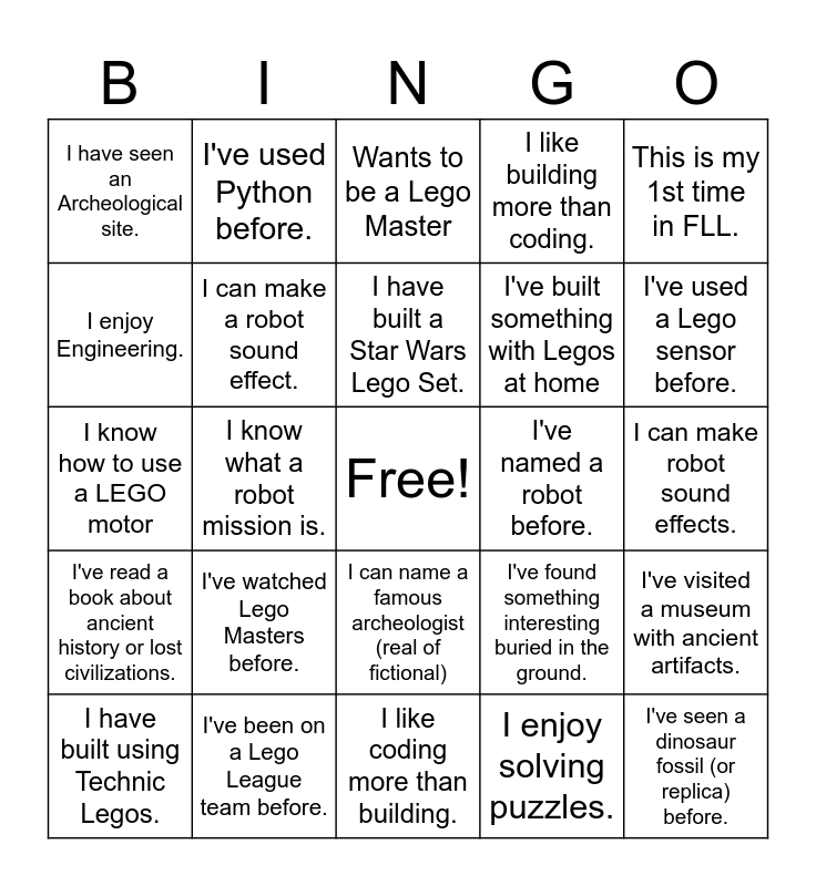 This bingo card has a free space and 24 words: I've watched Lego Masters before., I've been on a Lego League team before., I have built a Star Wars Lego Set., I have built using Technic Legos., This is my 1st time in FLL., I have seen an Archeological site., I enjoy Engineering., I've used Python before., I've named a robot before., I can name a famous archeologist (real of fictional), I've built something with Legos at home, I know how to use a LEGO motor, I've found something interesting buried in the ground., I've visited a museum with ancient artifacts., I can make a robot sound effect., I enjoy solving puzzles., I can make robot sound effects., Wants to be a Lego Master, I've used a Lego sensor before., I know what a robot mission is., I've seen a dinosaur fossil (or replica) before., I've read a book about ancient history or lost civilizations., I like building more than coding. and I like coding more than building..