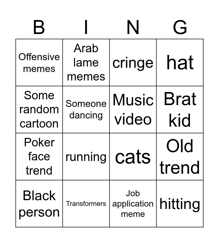 This bingo card has 16 words: Transformers, Old trend, cringe, Offensive memes, Poker face trend, Arab lame memes, cats, Job application meme, Some random cartoon, Someone dancing, Black person, hat, running, Brat kid, Music video and hitting.