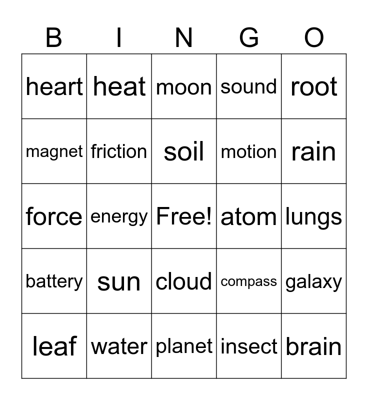 This bingo card has a free space and 24 words: sun, water, soil, leaf, root, heart, magnet, heat, atom, cloud, motion, force, compass, galaxy, friction, insect, lungs, moon, rain, energy, brain, battery, sound and planet.