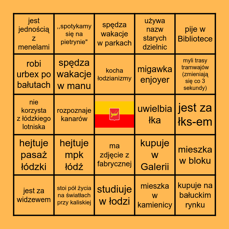 This bingo card has a free space and 24 words: hejtuje mpk łódź, stoi pół życia na światłach przy kaliskiej, kocha łodzianizmy, jest za widzewem, pije w Bibliotece, jest jednością z menelami, robi urbex po bałutach, ,,spotykamy się na pietrynie", uwielbia łka, ma zdjęcie z fabrycznej, migawka enjoyer, nie korzysta z łódzkiego lotniska, kupuje w Galerii, mieszka w bloku, spędza wakacje w manu, mieszka w kamienicy, jest za łks-em, spędza wakacje w parkach, myli trasy tramwajów (zmieniają się co 3 sekundy), rozpoznaje kanarów, kupuje na bałuckim rynku, hejtuje pasaż łódzki, używa nazw starych dzielnic and studiuje w łodzi.
