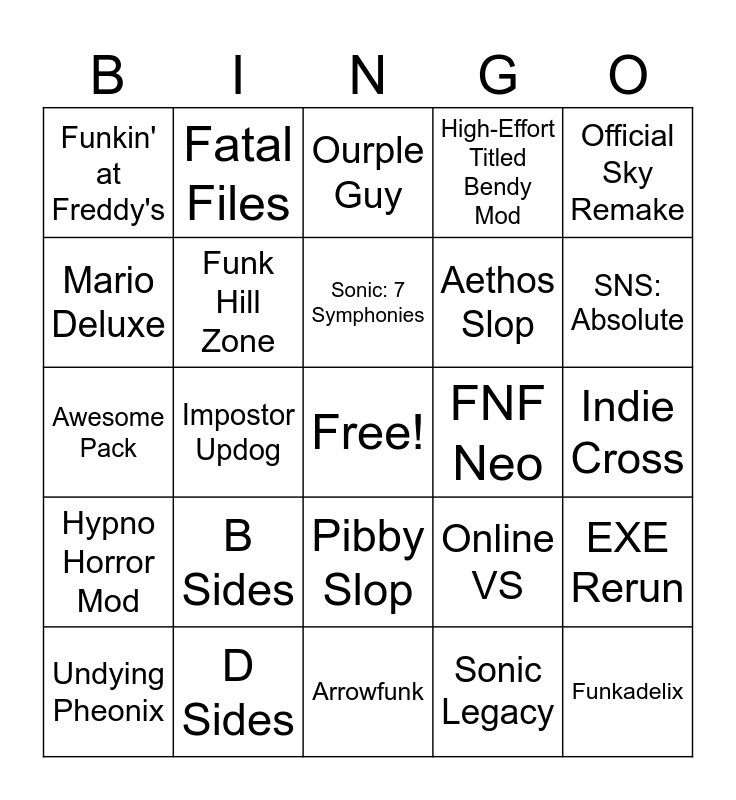 This bingo card has a free space and 24 words: B Sides, D Sides, Sonic: 7 Symphonies, Undying Pheonix, Official Sky Remake, Funkin' at Freddy's, Mario Deluxe, Fatal Files, FNF Neo, Pibby Slop, Aethos Slop, Awesome Pack, Online VS, EXE Rerun, Funk Hill Zone, Sonic Legacy, Indie Cross, Ourple Guy, SNS: Absolute, Impostor Updog, Funkadelix, Hypno Horror Mod, High-Effort Titled Bendy Mod and Arrowfunk.