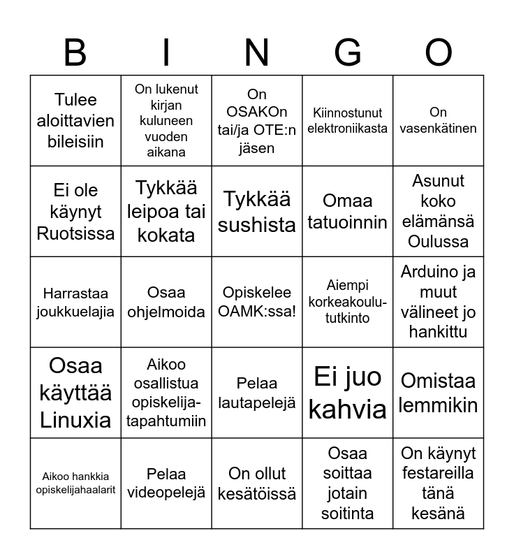 This bingo card has a free space and 24 words: Aikoo osallistua opiskelija- tapahtumiin, Pelaa videopelejä, Tykkää sushista, Aikoo hankkia opiskelijahaalarit, On vasenkätinen, Tulee aloittavien bileisiin, Ei ole käynyt Ruotsissa, On lukenut kirjan kuluneen vuoden aikana, Aiempi korkeakoulu- tutkinto, Pelaa lautapelejä, Omaa tatuoinnin, Harrastaa joukkuelajia, Ei juo kahvia, Omistaa lemmikin, Tykkää leipoa tai kokata, Osaa soittaa jotain soitinta, Arduino ja muut välineet jo hankittu, On OSAKOn tai/ja OTE:n jäsen, Asunut koko elämänsä Oulussa, Osaa ohjelmoida, On käynyt festareilla tänä kesänä, Osaa käyttää Linuxia, Kiinnostunut elektroniikasta and On ollut kesätöissä.