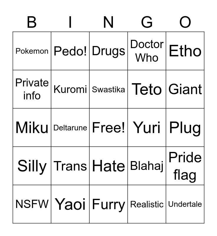 This bingo card has a free space and 24 words: Trans, Yaoi, Swastika, NSFW, Etho, Pokemon, Private info, Pedo!, Yuri, Hate, Teto, Miku, Blahaj, Pride flag, Kuromi, Realistic, Plug, Drugs, Giant, Deltarune, Undertale, Silly, Doctor Who and Furry.