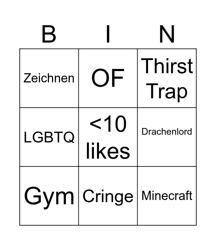 This bingo card has a free space and 8 words: Drachenlord, Thirst Trap, OF, Gym, Zeichnen, Minecraft, LGBTQ and Cringe.