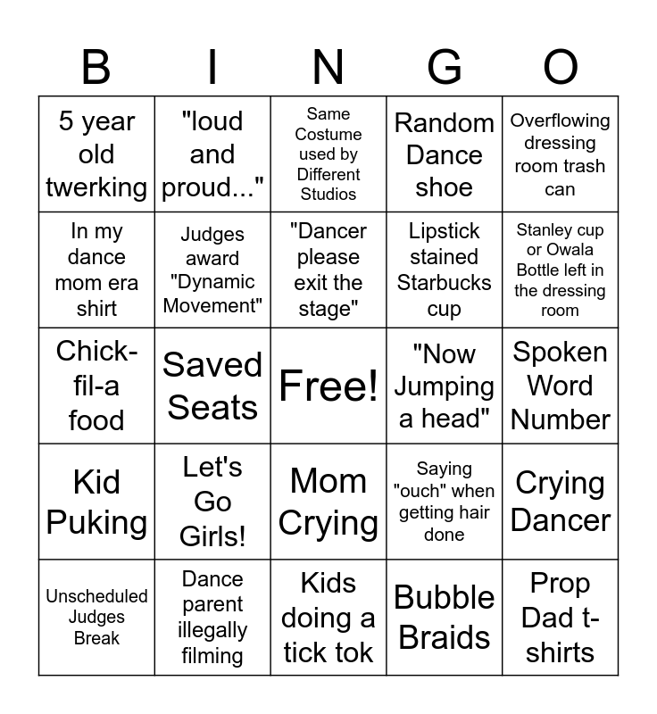 This bingo card has a free space and 24 words: Let's Go Girls!, Dance parent illegally filming, "Dancer please exit the stage", Unscheduled Judges Break, Overflowing dressing room trash can, 5 year old twerking, In my dance mom era shirt, "loud and proud...", "Now Jumping a head", Mom Crying, Lipstick stained Starbucks cup, Chick-fil-a food, Saying "ouch" when getting hair done, Crying Dancer, Judges award "Dynamic Movement", Bubble Braids, Spoken Word Number, Same Costume used by Different Studios, Stanley cup or Owala Bottle left in the dressing room, Saved Seats, Prop Dad t-shirts, Kid Puking, Random Dance shoe and Kids doing a tick tok.