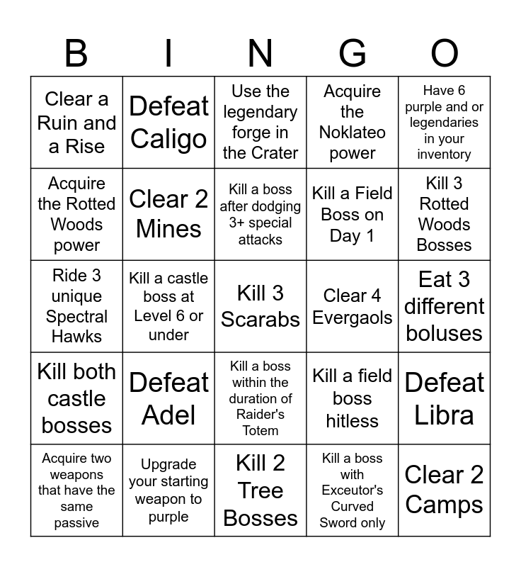 This bingo card has 53 words: Defeat Gladius, Defeat Adel, Defeat Gnoster, Defeat Maris, Defeat Libra, Defeat Fulghor, Defeat Caligo, Defeat Heolstor, Clear 4 Evergaols, Kill a boss after applying 3 status effects, Clear a Ruin and a Rise, Acquire 2 Local Clues, Kill a boss within the duration of Raider's Totem, Kill a boss with Exceutor's Curved Sword only, Kill a boss with Character Skills only, Kill both castle bosses, Kill a castle boss at Level 6 or under, Kill a boss after dodging 3+ special attacks, Acquire the Favour of the Mountaintop, Have 6 purple and or legendaries in your inventory, Acquire the Rotted Woods power, Upgrade your starting weapon to purple, Use the legendary forge in the Crater, Acquire the Noklateo power, Replay the tutorial and kill Morgott, Acquire two weapons that have the same passive, Predict your opponent's next square, Kill 3 Mountaintop Bosses, Kill 3 Crater Bosses, Kill 3 Rotted Woods Bosses, Kill 3 Noklateo Bosses, Defeat a Condemned, Clear all Cathedrals, Clear all Ruins, Clear 2 Camps, Collect all Sacred Flask Charges, Clear 2 Mines, Kill 2 Tree Bosses, Kill a Field Boss on Day 1, Clear an evergaol at Level 1, Defeat an Everdark Sovereign, Kill a Night Boss without using healing flask, Kill 3 Scarabs, Have 6 weapons of different classes in your inventory, Acquire 2 passive boss rewards in a row, Ride 3 unique Spectral Hawks, Kill a boss with bows only (not Ironeye), Finish off a boss with a consumable, Kill a field boss hitless, Eat 3 different boluses, Kill 3 red icon bosses, Defeat a boss with Exceutor's Ultimate only and Clear a mine and take the first reward.