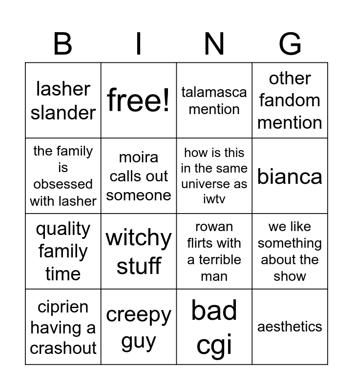 This bingo card has 34 words: rowan does magic, incest, oedipus complex, someone dies, aesthetics, how is this in the same universe as iwtv, the family is obsessed with lasher, rowan does something reasonable, free!, rowan does something weird, bianca, talamasca mention, we are confused, random music, creepy guy, witchy stuff, plot, rowan flirts with a terrible man, iwtv mention, ciprien crashout, rowan does something stupid, doctor stuff, lasher slander, bad cgi, random flashback, ciprien having a crashout, other fandom mention, eat/drink something they should not, quality family time, moira calls out someone, "whats his/her name", we like something about the show, someone is late/have to leave to the watchparty and editing reference.